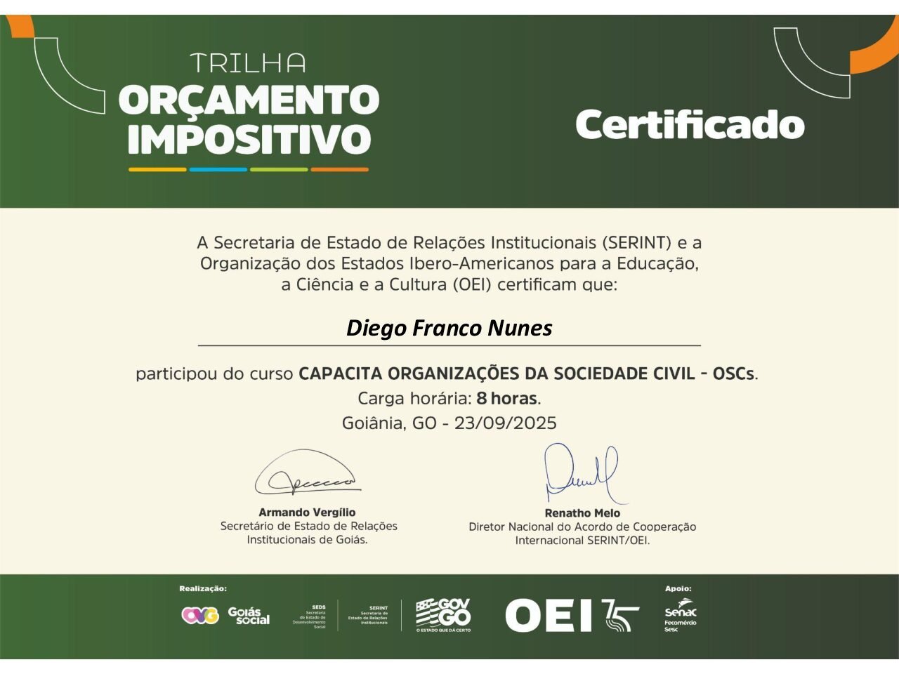 A Associação SOMA esteve presente na 2ª edição do Curso Capacita – Trilha do Orçamento Impositivo, realizado no dia 23 de setembro de 2025, no Teatro Goiânia, uma iniciativa da Secretaria de Relações Institucionais do Estado de Goiás (SERINT) em parceria com a SEDS, OVG e Organização dos Estados Ibero-americanos (OEI).